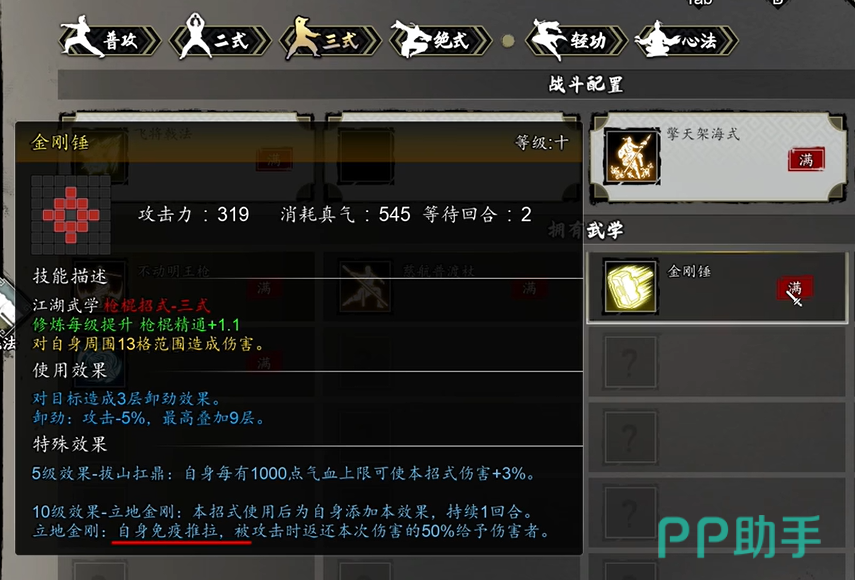 金刚锤的攻击力为319,相对来说消耗的真气也比较高,需要545,但是通过修炼和等级提升之后,枪棍精通是可以增加1.1的,这样一来,对自身周围的伤害范围便可达到13格。使用本招式攻击敌人可以对目标造成三层卸劲效果,使敌人的攻击力大大减弱。