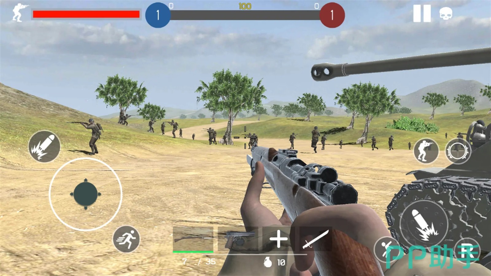 游戏背景为二战时期,游戏目前只有一张海岛地图。玩家可以自行设置双方兵力,最高可以支持50v50百人大战,50v50的大战场也是非常刺激呢。游戏中还有许多二战时期的武器供玩家选择,以及还有重装备,还能开坦克。游戏采用夺旗玩法,在战场上玩家需要跟敌人争夺据点,或者击杀敌人获得比分,哪方达到分数哪方胜利。玩家可以手拿步枪冲锋陷阵,扛着RPG轰炸敌人,还可以驾驶坦克轰炸他们。