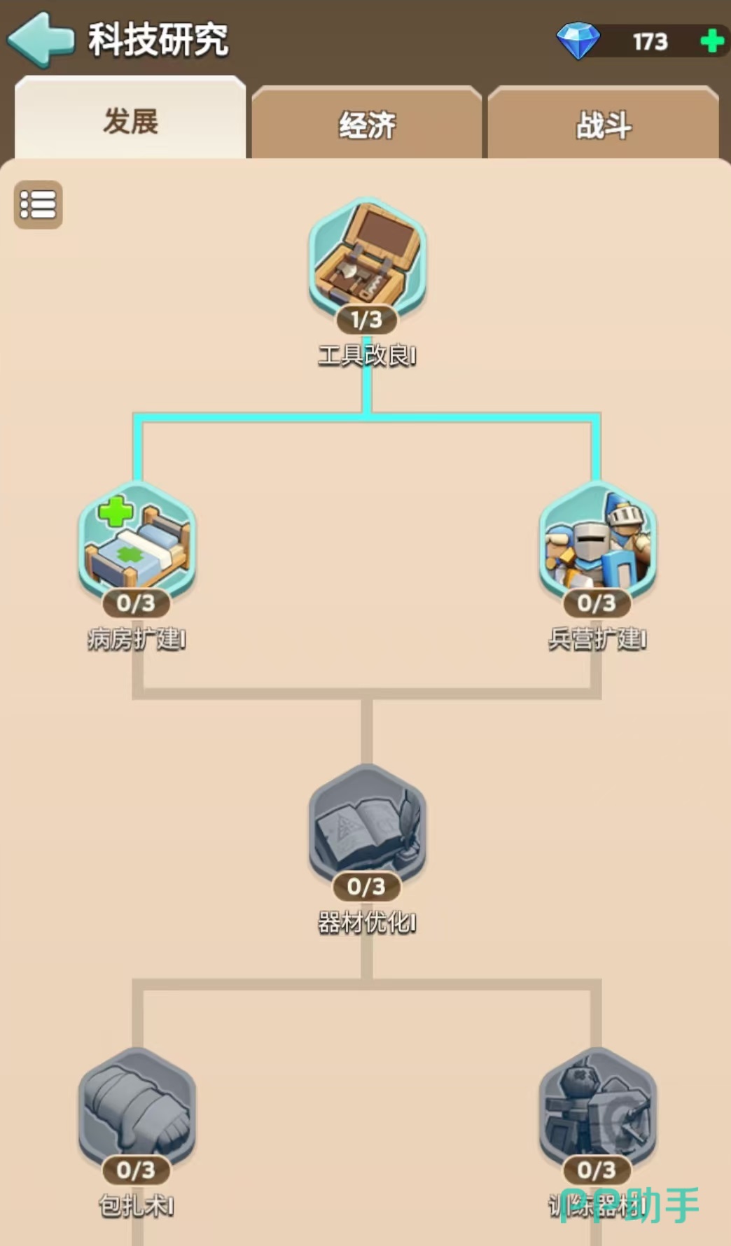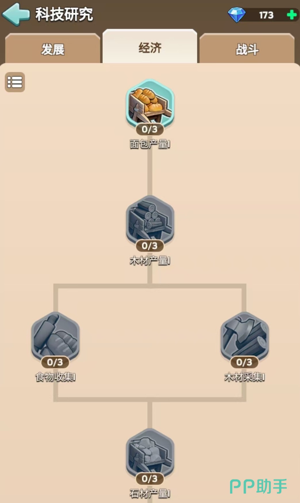 当玩家的城镇中心升到9级后,就可以解锁学院玩法,学院对应的就是玩家的个人科技。在这里同样可以进行科技研究,分为发展、经济和战斗这几类。小编的建议依然是在前期重点去加发展,研究这些科技需要消耗钻石,发展方面主要是提升建筑物的建造速度,各个建筑进行扩建以及增加派遣出征部队的数量等,这些对于前期开荒都非常重要,将发展的点完之后再去点经济,最后才是战斗。