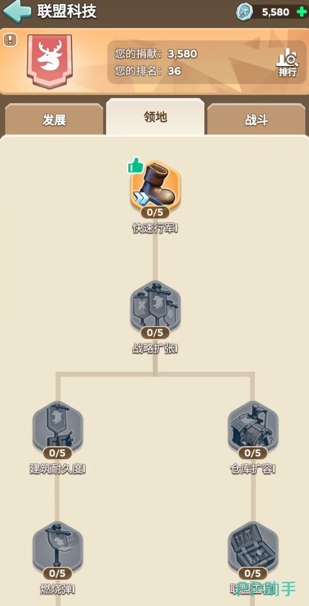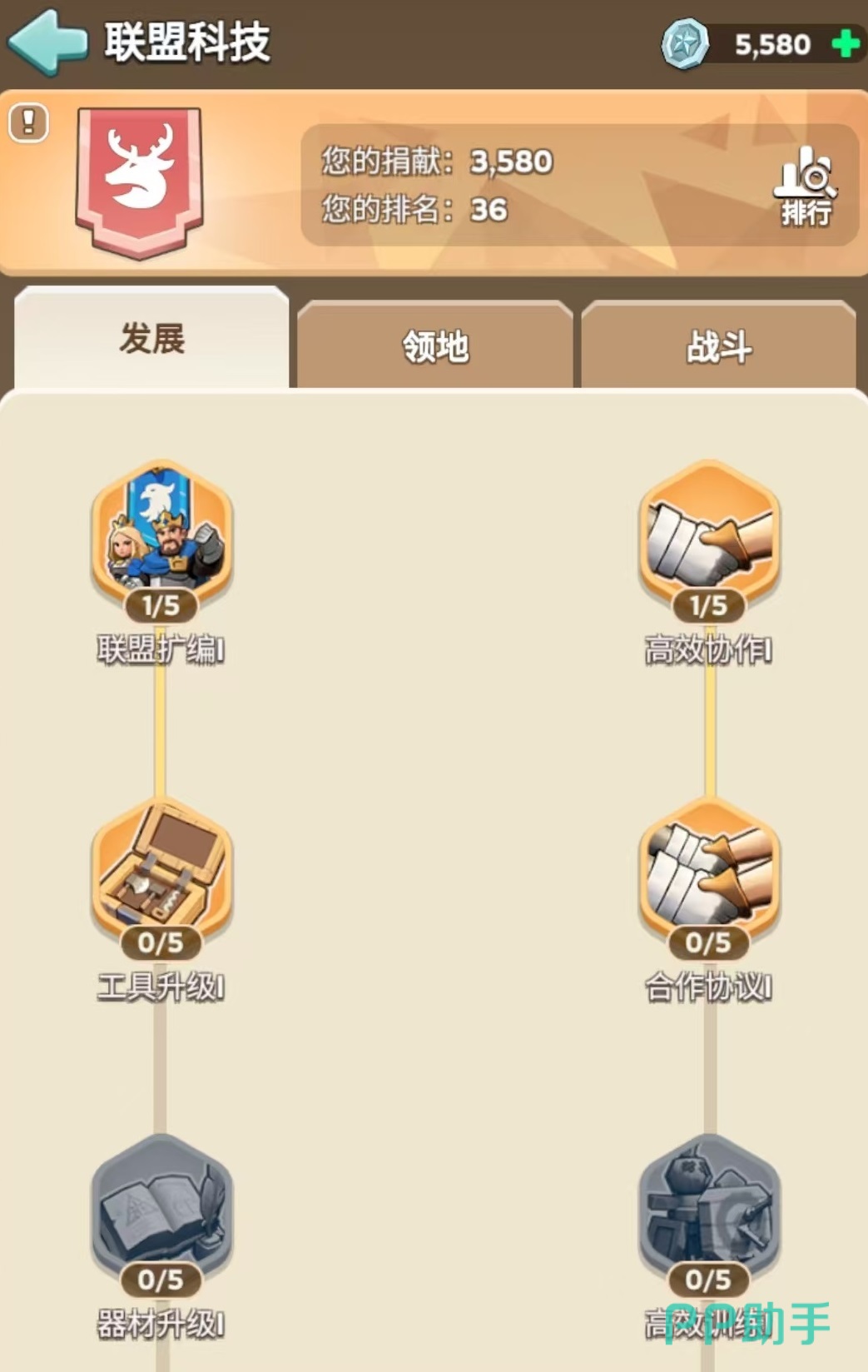 打开联盟科技之后,可以看到有发展、领地和战斗这三项内容,这里小编的建议是前期将有限的捐献点数投到发展方面,因为战斗方面的属性提升,对于前期的开荒来说并没有太明显的作用,领地的效果也稍次一些,所以发展是最关键的。发展主要包括提高联盟成员城镇建筑的建造速度,联盟互助时间缩短效果以及增加联盟互助的上限次数等,这些都可以帮助大家快速完成前期的建造,既能节省资源又能够通过助力减少时间,非常关键。