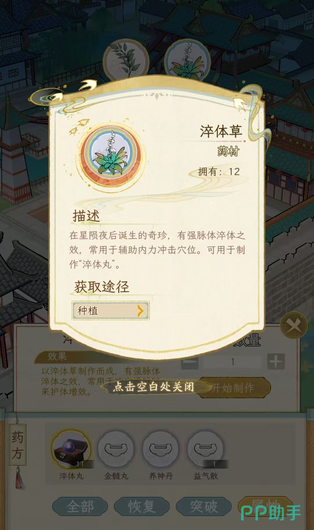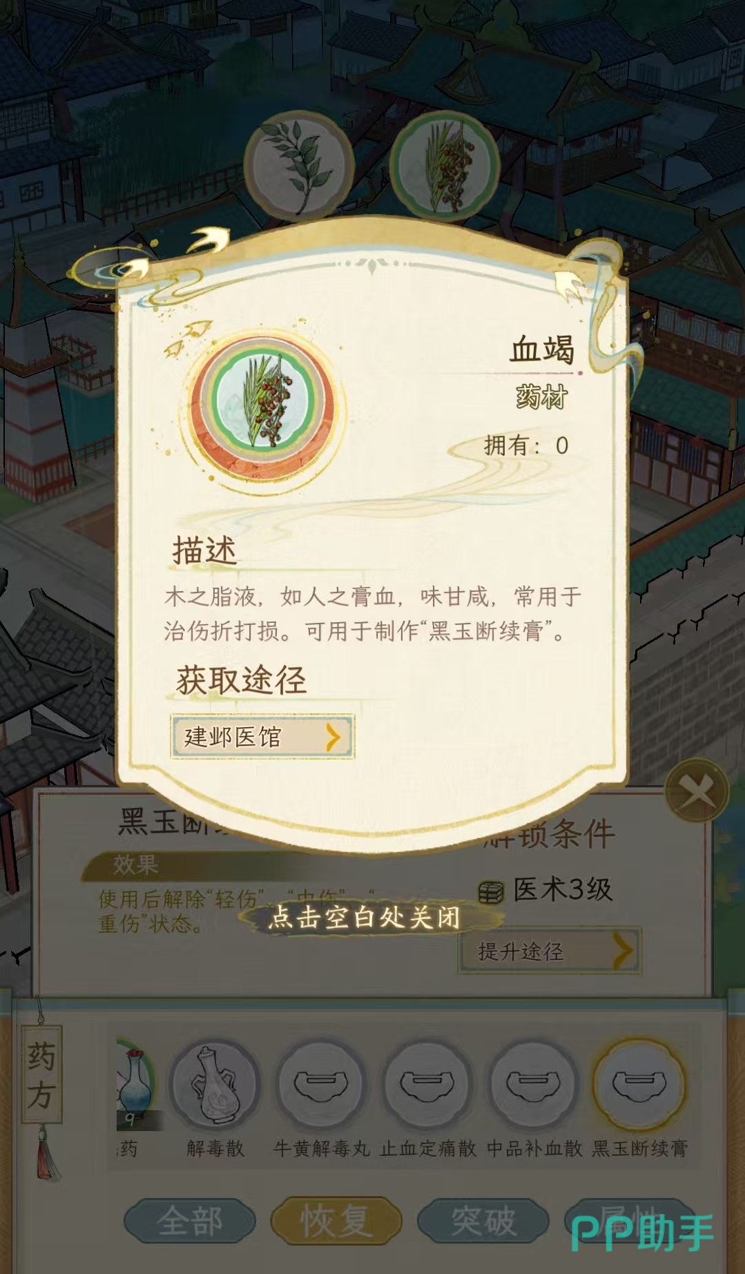 和烹饪玩法不同的是,在制药的时候直接就明确了配方,不需要自己再逐个尝试。大家需要做的只是收集足够的材料,先从低等级开始不断炼制,然后逐渐提升等级,就能制作更高级的药品了。制作的药品一共分为三大类,分别是恢复、突破和属性。数量最多的是恢复,作用就是用于恢复血量和解除各种状态。例如顶级的恢复药品黑玉断续膏,使用之后直接解除轻伤、中伤和重伤等状态,需要药草和血竭来制作得到。恢复血量的药品例如中品补血散,使用之后直接储备2万点储备气血,只需要药草可以直接制作出来。