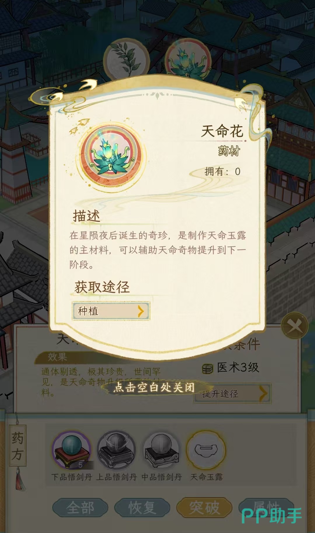 突破类型的药材非常关键,是修炼的必备品,主要包括下品悟剑丹、中品悟剑丹、上品悟剑丹以及天命玉露等。需要用到的材料包括药草、悟剑草、悟剑果和悟剑参等。属性药品主要包括淬体丸、金髓丸、养神丹和益气散。其中淬体丸是前中期最重要的药品,需要药草和淬体草得到,淬体草通过家园就能大量种植,用于冲穴通脉时护体增效。。