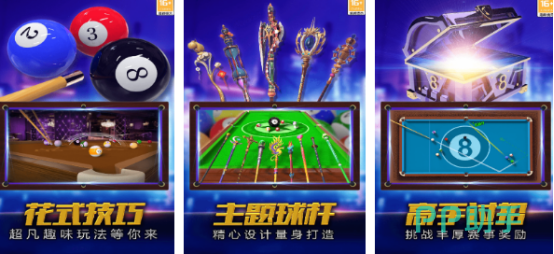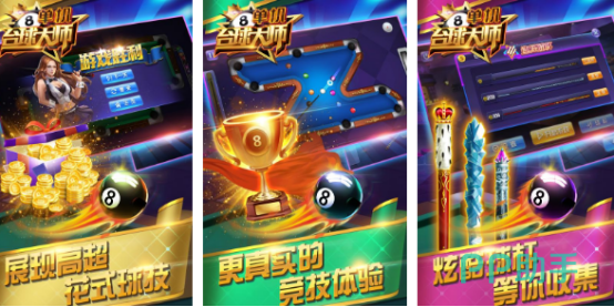 以真实8球玩法为主要核心采用3d建模高度还原真实的物理击球参数,就连光影效果也展现的无比逼真。支持单人练习也能通过WiFi的方式连接对战,与全球众多玩家完成实施匹配。提供超过40多款不同风格的球杆通过,参与全球公开赛又或者是淘汰赛来获得极其丰厚的奖励,整体的视觉效果表现极佳,给你带来沉浸式感受。