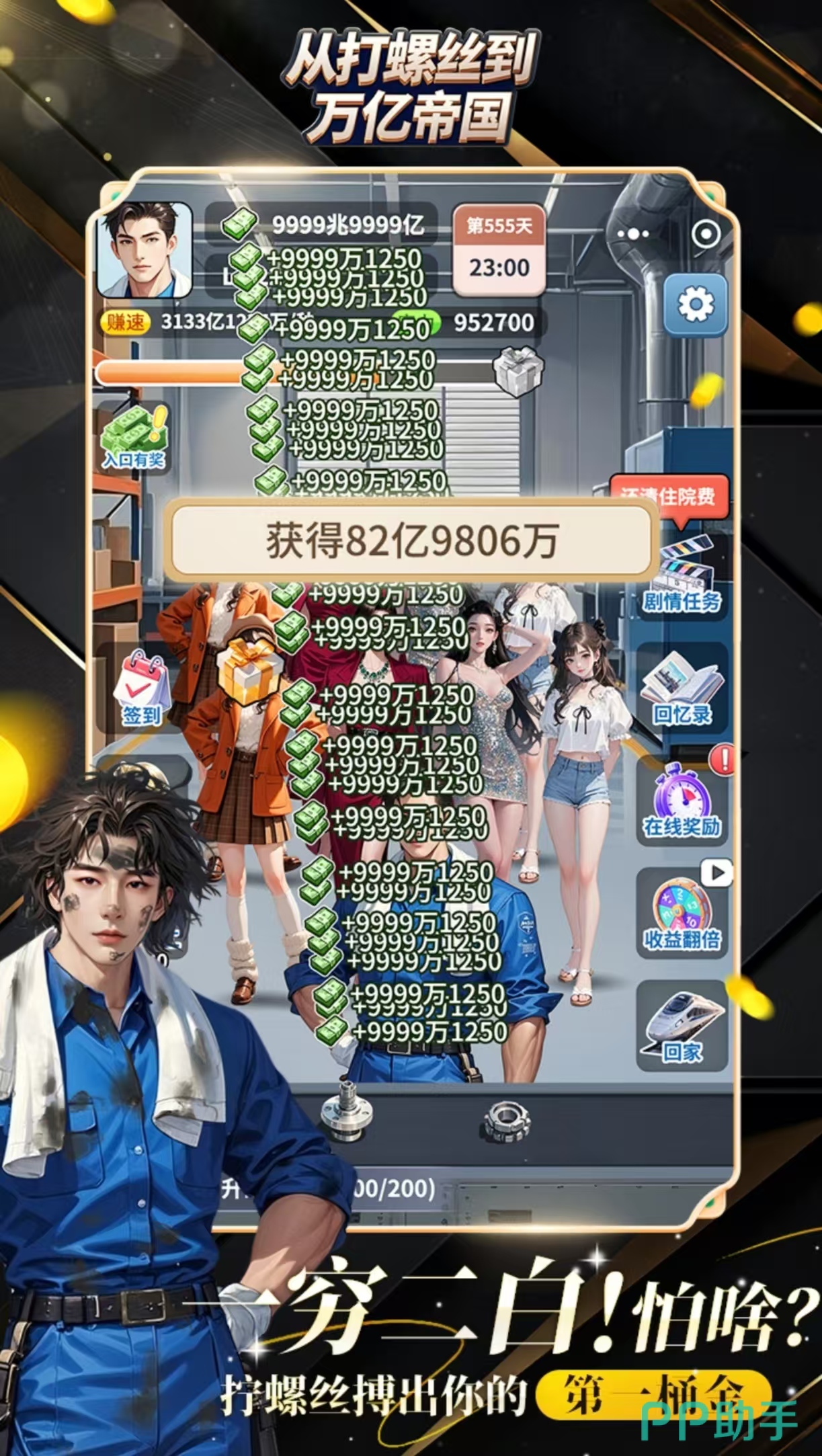 《从打螺丝到万亿帝国》玩家饰演的角色在游戏中重生,将来到一个工厂打螺丝,够体验到一个角色的逆袭之路。有很多幽默搞笑的剧情,可以要不断的提高自己的收益和能力,需要在一个工厂中工作,可以逐渐的赚取更多的工资,还有非常多感人的剧情故事加入。游戏内的剧情分为多个章节,每一个章节下都能遇到不同的角色,也会体验到很多职场上的生活,还可以遇到很多的恋爱故事。
