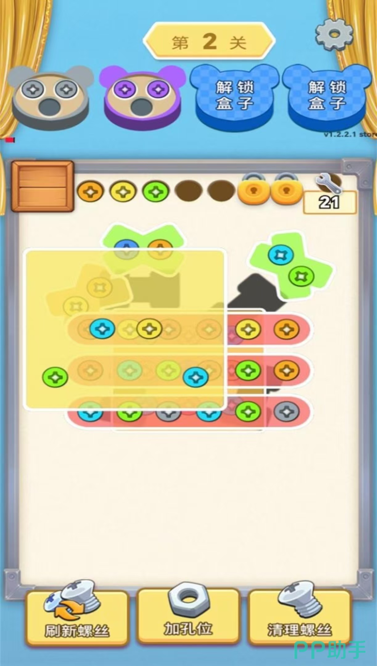 《拧螺丝消除》会出现很多不同样子的螺丝,他们被分为了多种不同的形状,需要通过各种方式将螺丝消除掉,游戏的上方会放着不同颜色的盒子,需要将指定颜色的螺丝放到盒子中。每个关卡内都会进入倒计时,需要在时间结束之前将所有的螺丝消除,玩家会逐渐进入更多新的玩家。在游戏的下方可以看到四种道具,分别能给玩家带来不同的作用,遇到困难的关卡时可以进行使用。