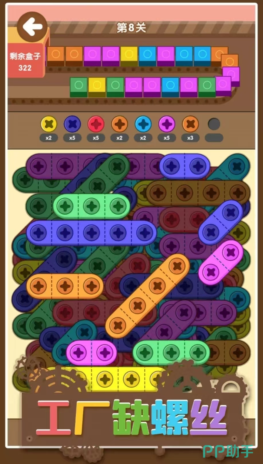 《工厂缺螺丝》玩家将成为一个工厂中的打工人,需要完成拧螺丝的任务,需要注意到螺丝被分为了五颜六色,需要将相应的颜色进行放置。相同的螺丝放在同样的盒子中,游戏内的关卡会逐渐增加,出现的螺丝种类和颜色也会更多,将面临到更多的挑战难度。每个关卡内的螺丝都会错重复杂的排列,需要玩家将他们全部的清除,可以使用到的工具也非常多,游戏内也会增加一个时间限制。