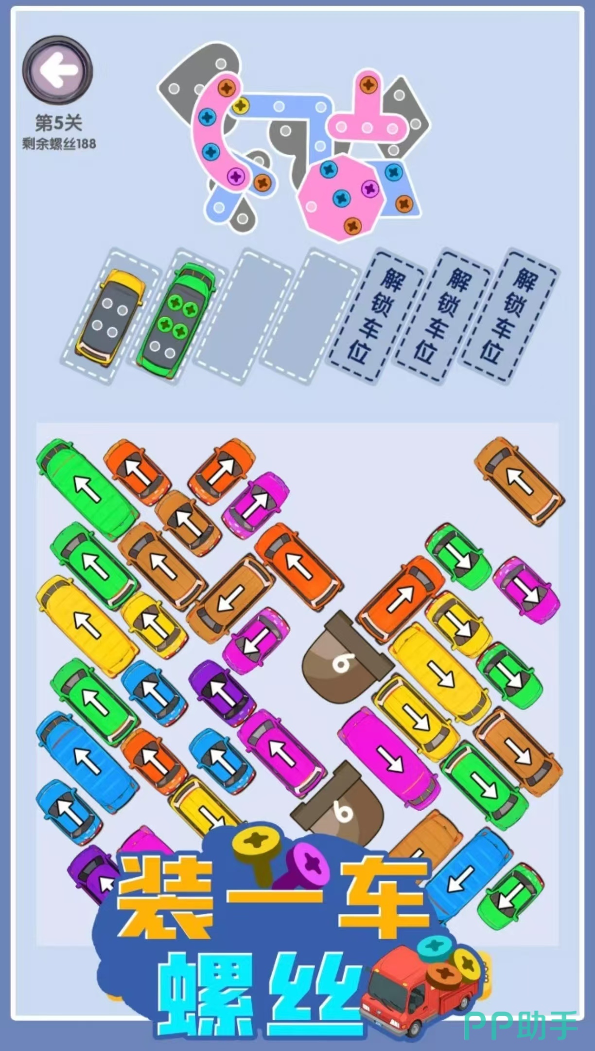 《装一车螺丝》游戏里面给出了非常多的汽车,需要不断的进行挪车的体验,在过程中也需要将对应的螺丝解开。可以看到拥有着各种不同的颜色,需要观察汽车和螺丝的颜色,将他们配合起来成功的完成,揭开的螺丝会自动的放到车厢中。而汽车则需要根据箭头的方向,按照指定的方向进行移动,游戏的过程中需要不断的思考,每个关卡内给出的难度不同,也比较考验玩家的动手能力。
