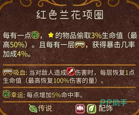 第二个则是红色兰花项圈。这个物品也是有星的时候攻击可以进行触发。玩家们每有1点幸运的话,星将会偷取3%的生命值。这个加成最多为50%的生命值,每有一层吸血,那么玩家们会获取4%的暴击率。