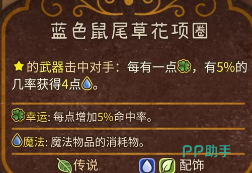 这个流派目前第一个推荐的装备是蓝色鼠尾草花项圈。这个装备本身有两个效果,首先第一个效果是如果有带星的武器击中对手的话,我们每有一点幸运,那么便会有5%的概率可以获取到4点魔法。第二个则是每点幸运增加5%命中率。