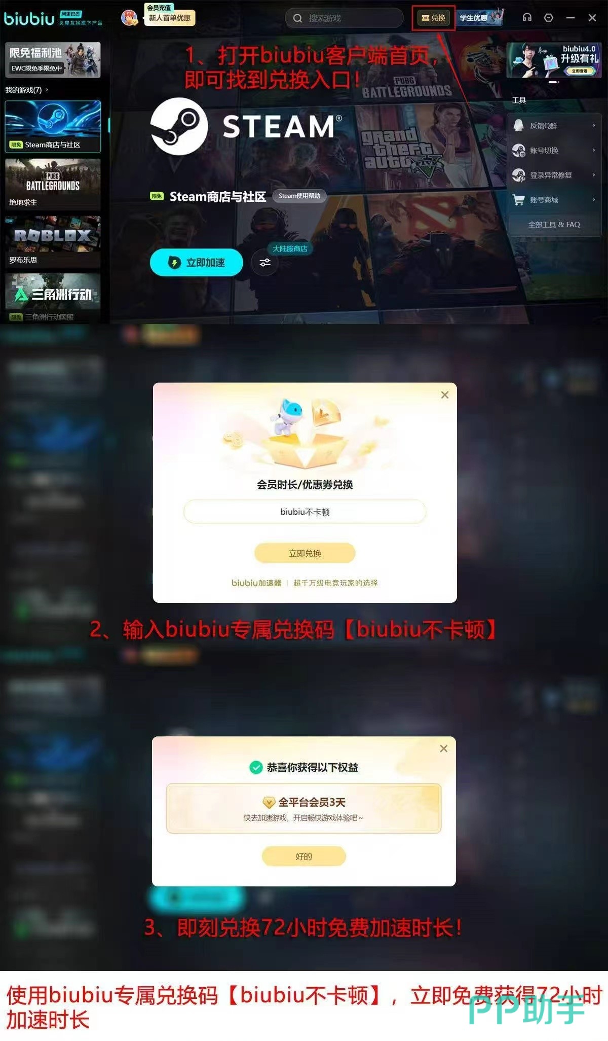 不得不说,biubiu加速器的福利真是诚意满满。新用户首次登录不仅能立刻享有24小时的免费加速,无需任何复杂操作或绑定支付信息,轻松解锁全功能体验;而且只要在软件内输入专属口令【biubiu不卡顿】,即可额外领取72小时的免费加速时长,这样一来,合计高达96小时的超长免费试用时间,让玩家尽情感受biubiu带来的极速网络体验。对于像《战地6》这样对网络稳定性和响应速度极为挑剔的游戏来说,这段充分的试用期不仅让你能在不同时间段多维度测试加速效果,还能智能选择最优节点,最大限度地减少延迟和丢包,帮助你实现真正的无卡顿畅玩,彻底解锁游戏潜力,助力每一场战斗稳操胜券!