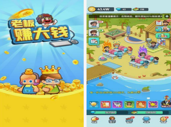 将体验身为公司老板每天的生活状态,为了使自己的公司拥有更高的收入,不仅要招募员工,也要根据员工们所具备的技能,不同分配合适的岗位。屏幕上点击相应的文字以及按键以后,就可对公司进行管理,赚到了大钱以后,也可进行其他方面的投资。依旧采用的是比较轻松的方式,进行设计人物,既精致又可爱,点击员工以及各方面的文字以后,以赚取更高的收入为主要任务。