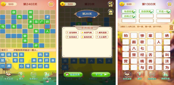 在成语填字接龙闯关游戏中,以成语为核心将填字与接龙两种经典玩法相结合,打造出极具挑战性的关卡,游戏的关卡以方格形式呈现,每个方格中需要填入成语中的一个字,同时前一个成语的最后一个字要与后一个成语的第一个字相同,形成一条连续的接龙链条,随着关卡的推进,成语的难度会逐渐增加,从常见的四字成语到生僻的典故成语,链条的长度也会不断延长。