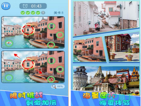 作为在两张图片中找到不同之处的此游戏,涵盖了生活中的很多场景以及各种美图,你需要在玩的时候,尽可能的在规定时间内,找到所具备的不同之处,规定的时间为120秒。通过找到5个不同之处,点击不同的位置以后,完成闯关任务。还有超多的工具,比如在时间并不够用的时候可以使用加时道具,在自己也不知道不同之处在哪里的时候,同样可使用万能道具。