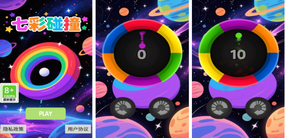 色彩缤纷的游戏画面还以休闲的玩法为核心,在开局之后将会呈现出七彩的圆环,也就是由七种颜色组合而成。你要利用自己极高的反应能力,通过左右旋转的方式,让其中的小球在相同颜色的位置之下成功落下就能够让圆环变得越来越大,从而也能够获得相应的分数,每个关卡中分数的要求以及任务要求是完全不同。要仔细了解具体的规则,完成闯关。