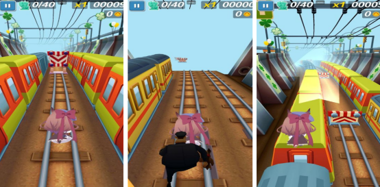 以经典的跑酷玩法为核心,呈现出来的地图场景极其丰富,比如有地铁轨道以及城市道路等等,虽然操作的玩法特别简单,但是却比较考验玩家的反应能力。因为在奔跑的过程当中总是会呈现出大量的障碍物以及大量的金币,您需要及时躲避障碍物,收集大量金币才能提升个人等级,解锁更多炫酷道具,让自己快速加速。