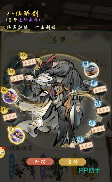八仙醉酒属于丐帮的进阶武学,其中的“果老抛杯”,能额外增加招式3点的伤害,并且让招式暴击率提升42%,命中率下降25%,这样的伤害翻倍能够实现一招制敌。
