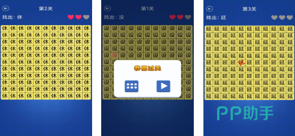 汉字找不同是款满屏汉字的特殊互动解谜游戏,密密麻麻的汉字中只有一个与众不同需要大家快速找出来,点触式的操作设定难度不高令玩家越玩越上瘾,多线性的关卡会让玩家见证多种多样的汉字,操作简化且整体交互性更高给人留下深刻印象,游戏节奏也很慢可以让玩家沉浸游戏中慢慢寻找汉字。