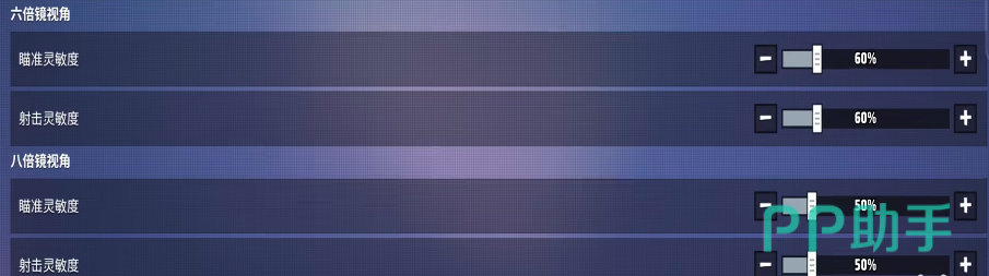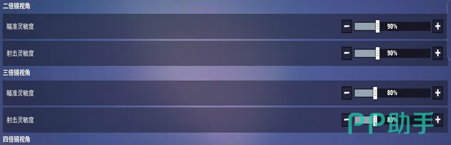 二倍镜视角当中,瞄准灵敏度和射击灵敏度也调整到90%。三倍镜中的瞄准灵敏度,射击灵敏度调整到80%。四倍镜中瞄准灵敏度,射击灵敏度调整到70%。六倍镜视角中的瞄准灵敏度,射击灵敏度调整到60%。八倍镜中的瞄准灵敏度、射击灵敏度调整到50%。