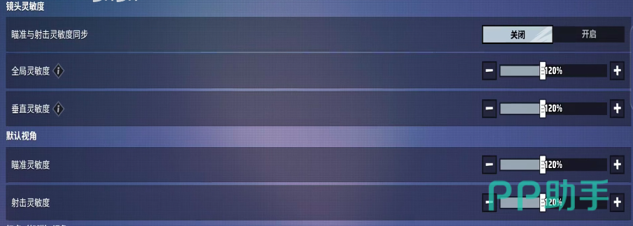 镜头灵敏度当中,瞄准与射击灵敏度同步选择关闭。全局灵敏度和垂直灵敏度调整到120%。默认视角当中瞄准灵敏度和射击灵敏度也调到120%。红点(机瞄)视角中,瞄准灵敏度,射击灵敏度调整到90%。