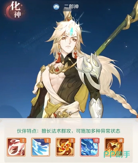 与哪吒一样是侧重法术群攻的伙伴,同时也是七日获得可以拿到的最终奖励,并且他的攻击不光能对敌方造成大量的伤害,还有概率可对他们施加很多异常效果,强度上限很高,在玩家为地府职业时,可用二郎神与哪吒组成双输出来快速刷怪,非地府职业时也能配合他令战斗更有效率。