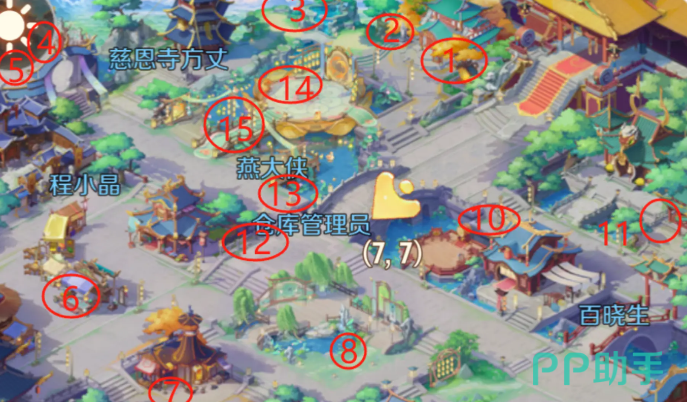 往建筑的后方走,能看到一片湖,我们绕着湖的边上一直走会发现一个集运葫芦,顺着找到的方向继续向着右走,能看到一个宝箱,我们向着百晓生的方向前进,一直直走在前方又能发现一个宝箱,剩下还有很多要搜寻的物品,大家可以跟着下图来依次去找。