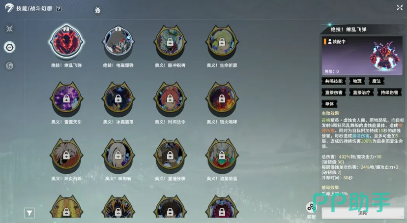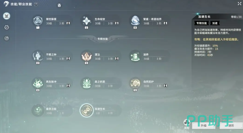 其中升级操作主要是提升技能的固定数值部分,让每次释放都能造成更稳定的伤害或产生更强的效果,进阶则是着重提高技能的倍率,此外部分增益类技能还会带来效果量的显著提升或者持续时间的延长,在这里要特别提醒各位玩家,本职技能的评分仅基于大家当前实际装备的技能进行计算,其中基本攻击、特殊攻击以及终极技能属于固定携带项目,除此之外大家还拥有自主选择的权利,可以从众多选项中挑选四个选配的专精技能进行搭配,通过对这七个技能的精心升级与进阶,就可以提升技能模块的战力分数。