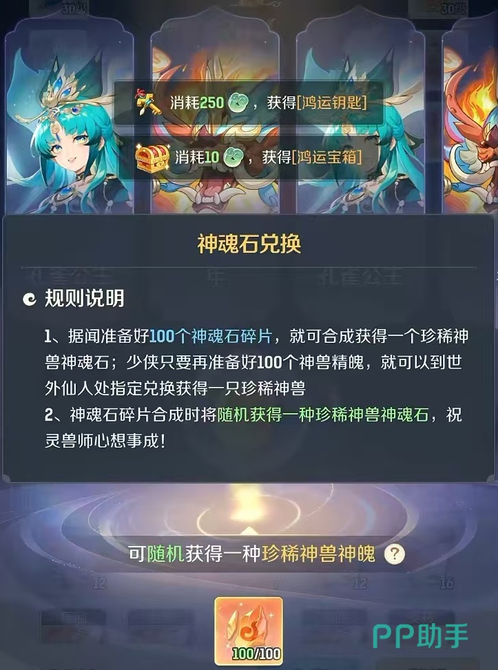 玩家在游戏中可以通过准备好100个神魂石碎片,合成珍稀神兽神魂石,然后再准备好100个神兽精魄,就可以兑换得到一只珍稀神兽了。在神魂石碎片合成时,将随机获得一种珍稀神兽神魂石,这也是获得神兽最主要的手段。另外还可以通过充值的方式来获得部分神兽,总之神兽的获取有一定的难度,但实力也非常强悍。