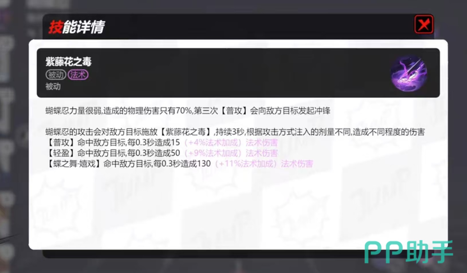 第2个技能暗刃,使用隐藏的刀刃攻击敌方目标造成物理伤害,并使目标减速两秒钟,该技能可以在被控制的时候使用,命中目标后会恢复生命值。第3个技能蝶之舞嬉戏,选中一个敌方角色后短暂起飞,并向目标俯冲,穿过该角色快速攻击5次,这个技能触发的被动伤害是最高的。第4个技能调毒,根据敌方目标情况改变配比,并标记一个目标,对该目标造成的伤害提升,对其他目标造成的伤害下降。这是一个典型的集火类型的技能,一定要根据场上的情况选择正确的目标,这样才能保证切入之后快速秒掉。