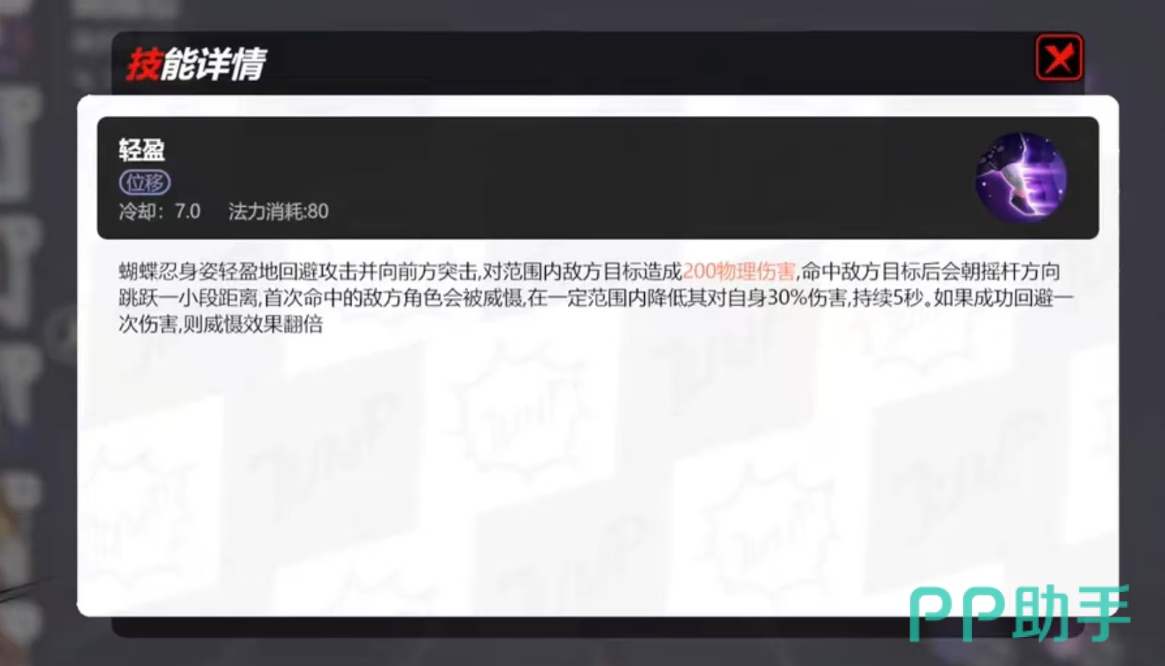 第1个技能轻盈,可直接回避攻击并向前方突击,造成范围伤害,命中敌方目标后会朝摇杆方向再跳跃一段距离。首次命中的敌方角色会被威慑,被威慑之后,能降低其对自身的伤害,持续5秒钟。如果此技能成功回避一次伤害,则威慑效果翻倍,该技能既有位移效果又有控制和伤害,是蝴蝶忍的核心技能。而且要利用好和被动的联动,利用轻盈去注入剂量,打出比普攻更高的伤害。