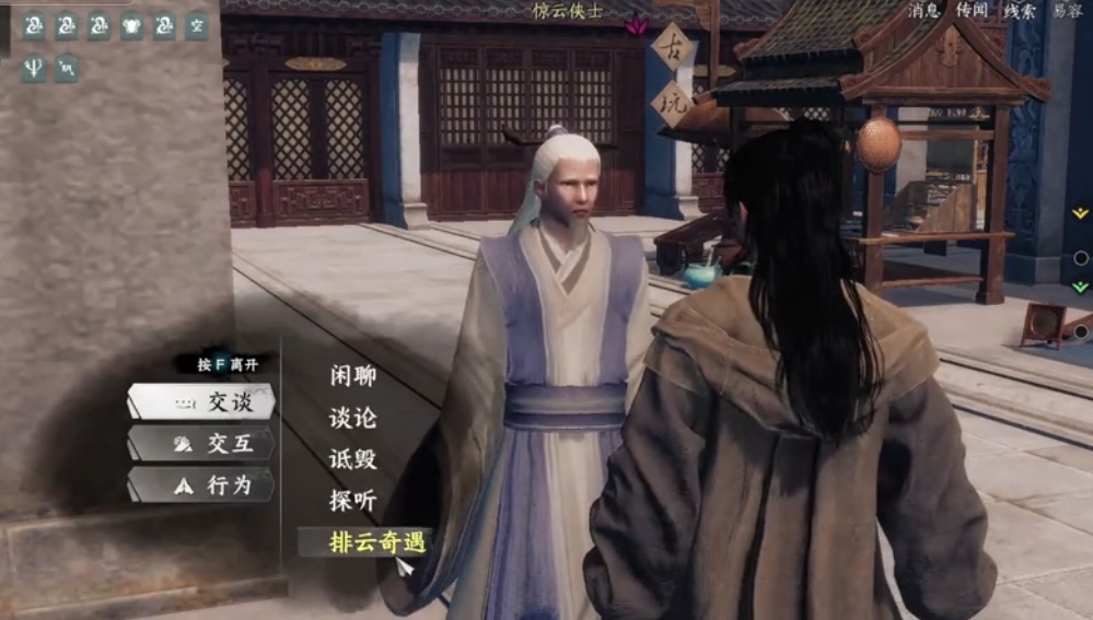 玩家需要先来到指定的地点,然后找到侠士。和侠士对话之后,对方就会提到对人生意义的思考。在一段对话之后,玩家选择了解详情,将触发后续的剧情。得知这一位侠士原本是来自于经商之家,从小就聘请名师准备考取功名,但却始终未曾能够得偿所愿,而自己的发小也有相同的经历,一心想要成为大亨,打算将家族的商铺开到关外。玩家在了解到背景故事之后,接下来就可以选择去接取任务,完成任务。