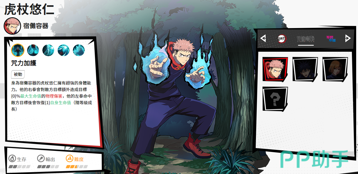 虎杖悠仁作为《咒术回战》的核心主角,凭借其标志性的黑闪机制与独特的体术战斗风格,成为游戏中极具特色的战士型角色。那么漫画群星大集结虎杖悠仁怎么样?根据最新版本数据,虎杖悠仁在T1级别角色中稳居前列,尤其在对抗夜属性弱点的敌人时表现尤为突出。本期将全面剖析这位"咒术高专体育生"的战斗特性、技能机制,帮助各位快速掌握其从基础操作到高阶战术的全套战斗体系。