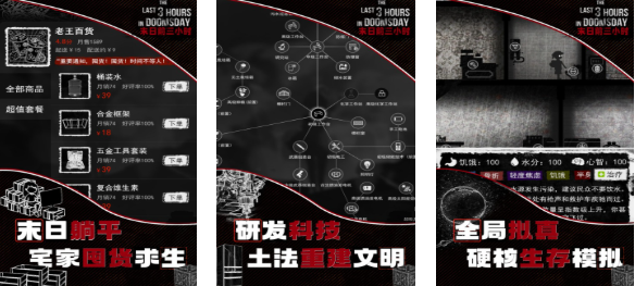 末日前三小时也是款竖屏操作的末日生存游戏,玩家可尝试在文字末日世界中存积物资度过难关,游戏会给玩家三小时左右的准备时间,然后丧尸末日就会降临让玩家感觉毛骨悚然,你不仅要尝试对抗不断袭来的僵尸,还要尝试重新创造文明并发展各种科技,极具特色的拟真生存体验令文字游戏爱好者着迷。