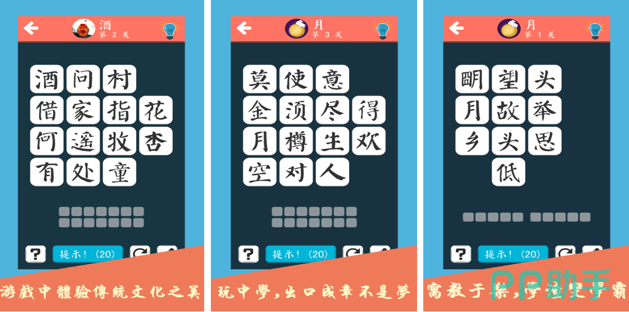 这是款将传统诗词文化和益智类玩法完美结合的佳作,传统文化的精髓在本作中融会贯通,各种让人印象深刻的诗词歌赋都会在游戏中展现,沉浸式的互动玩法保证能让你记住更多的诗词歌赋,超前的互动性加上古色古香的背景更受玩家喜欢,如果你也想沉浸在诗词歌赋的世界中自由互动,那这款诗词解谜类的小游戏你可别错过。
