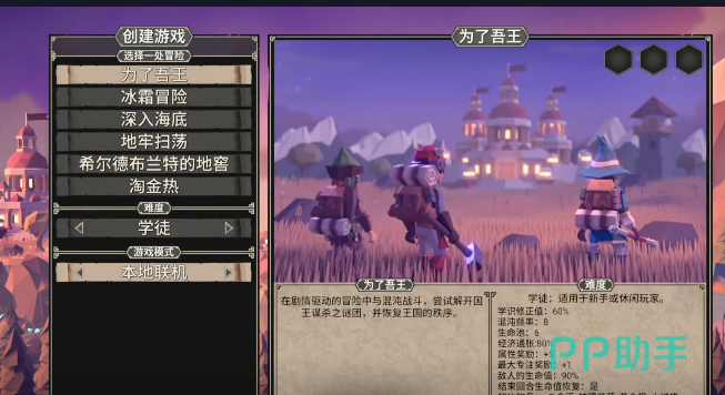 想要加入本地联机操作很简单,只需要把游戏模式直接切换一下,然后就能够操作。游戏的背景其实也很有代入感,在这个神秘的大陆上,因为国王被暗杀,整个大陆全部都会陷入到混乱的阶段。女王就开始召集勇士准备去拯救整个国家,而玩家所扮演的就是这一群勇士。想想也会觉得很有使命感,角色方面是很自由的,有8个可以挑选的职业,还有6张地图可以选择。所有角色的外观都是很有自由度的,玩家可以根据个人的喜好,然后去打造专属的勇士,这一点细节其实比较贴心。