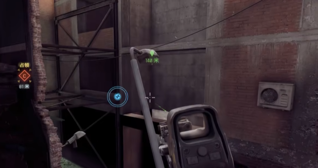 12、在太平军出生点位出发的路上可以看到下图当中的房区,准心命中的空调就是我们向上爬的基石,跳上去打烂头顶上的雨棚,就能向左侧雨棚上跳跃,后续就用同样的方式一层层跳上去,最终到达楼顶。还想去更高的地方,就在墙垛上架起防御盾牌,跳到上一层房顶。