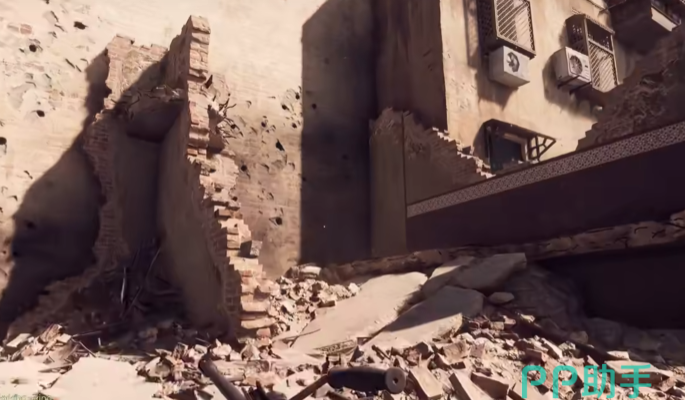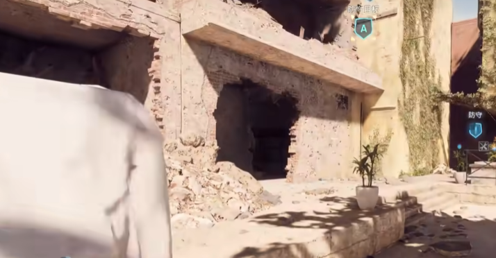 6、太平军B点外墙,来这里可以看到围墙倒塌了,爬上去之后通过伸出来的窗台跳上去,不够距离的位置可以自己架一个防御盾借力跳上去。