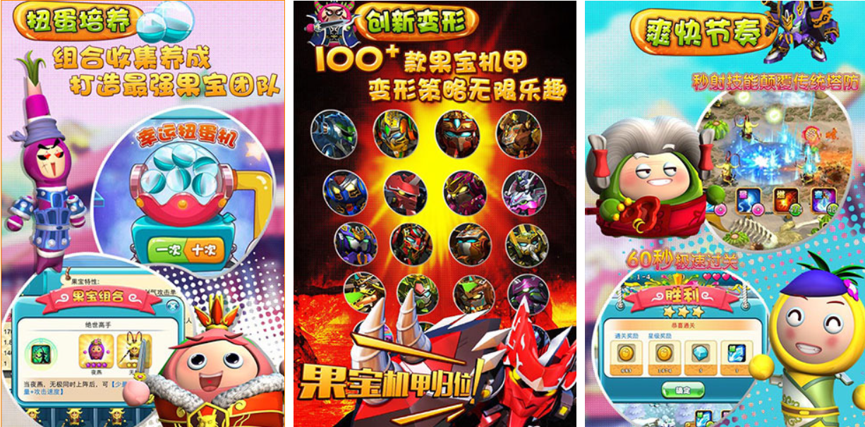 果宝勇士这款漫改佳作继承了“果宝特攻3”的基础剧情,采用了独立的运行方式和塔防战斗体验,游戏呈现出刺激的机甲对抗机制也有着很快的节奏,轻松执行的塔防策略任务增加了游戏的快感,还融合了机甲合成、变形的玩法让游戏更显刺激,超多的酷炫果宝特攻们将再次出现与你一起执行任务。