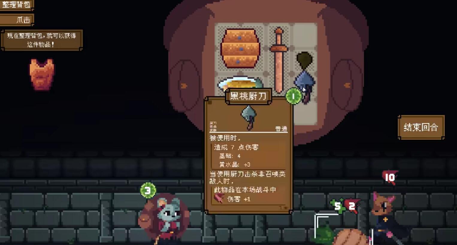 玩家在攻打黑暗中的赤狐时,需要了解赤狐的特点,背包英雄作为一款具备肉鸽元素的游戏,赤狐在黑暗中的闪避跟攻击力都是比较强的。在这样的情况下,玩家如果想要打赤狐的时候,需要合理的运用装备跟策略,在装备方面来看,玩家可以直接选择黑桃厨刀,它作为一件特别普通的武器,在使用的时候却能够造成7点伤害,而它的基础值为4。另外玩家如果能够合理的利用它的时候,还可以累积对应的伤害,这样的话能够快速的将黑赤狐给打败。