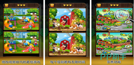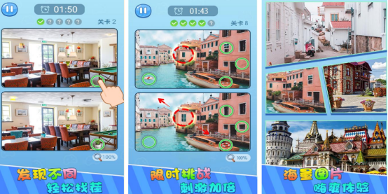 有趣的休闲益智类作品,趣味闯关两张看似相似的照片却隐藏着很多不同之处,支持无限时间挑战,局部可以放大,这样能精准的捕捉到各种细节。加入三次试错机会,这样能够全面增加游戏的通关率,也能够增加错容率。其中所包含的关卡超过300多关,难度随之提升,覆盖风景人物建筑等不同的多样化主题,采用卡通风格设计,比较适合碎片化时间体验。