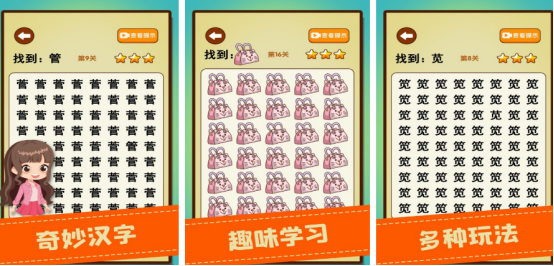 在每个关卡当中,有众多相同的文字,看似全部属于同一种文字,实则详细观察会发现在汉字排列的过程当中有唯一不同之处。核心玩法就是在相似的汉字当中,寻找到有差异的地方,关卡拥有数百个,涵盖汉字组合通过放大,亮度调节等不同的视觉效果来辅助辨别,寻找到各种细微差异。