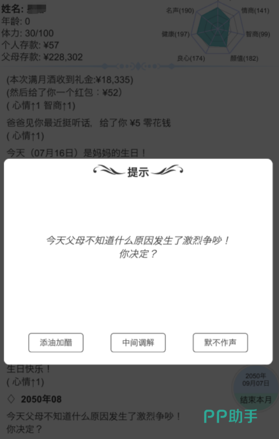 这款有极高的自由度极高的游戏当中,以文字玩法为主要题材将扮演一个角色,从出生到去世,整个过程全部都由你来决定,具体的角色人生路径也由你来选择,比如职业选择社交活动结婚生子。在结婚养娃之后,宝宝的具体活动情况以及相应的成长路线也由你来决定。