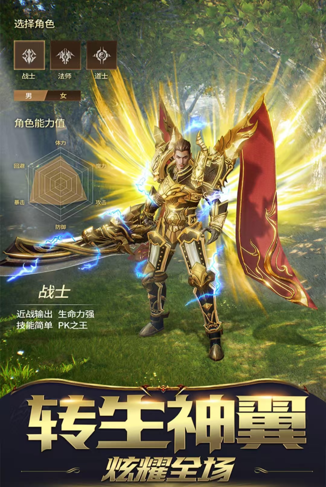 竖屏画面的传奇游戏,写实渲染出各种酷炫装备,黄金翅膀,转生神翼等奇幻设定,用强大的游戏引擎做支撑,刻画出炫丽的特效效果。装备武器酷炫十足,正版授权游戏,超强代言人,神兽召唤设定,多种稀有宠物傍身。支持挂机,自动拾取完成任务,自由升级,竖屏操作解放双手,给玩家一个全新的放松传奇挑战。