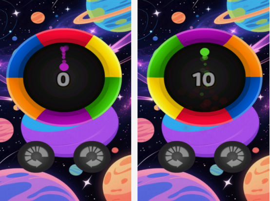 家里面也可选择这款比较轻松又休闲的,不需要联网,大家就能控制里面的七彩圆盘,利用不断旋转的方式,使小球在与自己颜色一样的位置落下以后,来获得相应的分数。相对与大家比较喜欢玩的各种类型的,在玩法上虽然也有一些类似的地方,不过却有着一定的难度,需要在玩的过程当中,点击屏幕上的操作按键,使小球球不断的,与各种颜色进行碰撞。