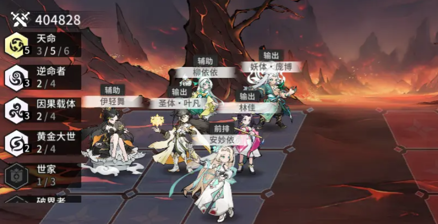 阵容成员如下图所示,这一套激活了天命羁绊,可以在进入战斗时,让我方全体属性提升10%,养成难度低的同时,生存能力比较强,主要依靠叠加灼烧状态来进行持续性的输出;