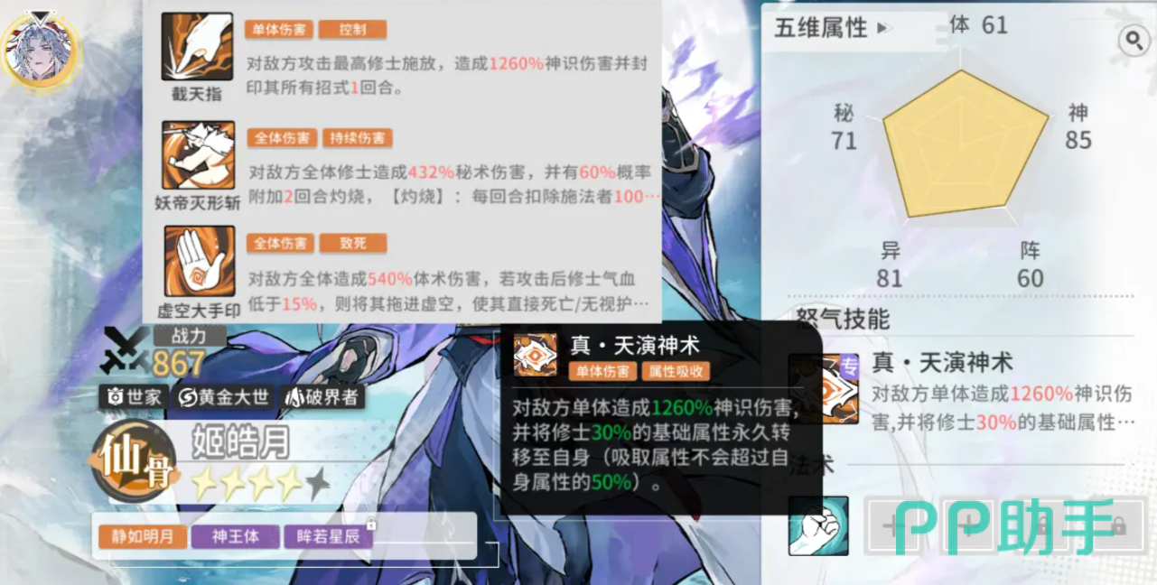 他的“截天指”能直接对敌方攻击最高的修士使用,对其造成超高的伤害并且还能封印其所有招式一回合,队伍阴阳和紫府圣子都属于前排,使得队伍非常肉,其他三位辅助主要添加增益,保证姬皓月的输出能力。