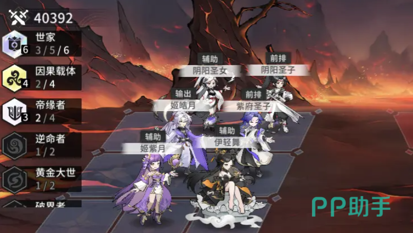 世家阵容成员如下图所示,这一套激活了世家羁绊,能在我方修士获得增益时,让属性提升,该阵容养成会比较困难,3个SR都比较依赖星级,比较适合去打PVP,队伍中技姬皓月是核心输出;