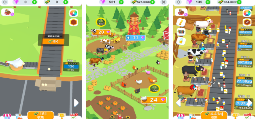 鸡蛋工厂大亨是一个经营游戏,游戏里玩家会拥有一个属于自己的农场,在这里可以饲养各种不同品种的鸡,还可以饲养其他的动物,饲养成熟的动物就可以放到流水线上,能产出大量的鸡蛋以及奶制品,玩家可以通过销售的方式获得收益,也可以通过孵蛋,扩充农场的小鸡数量,这样就能孵化更多的鸡蛋。
