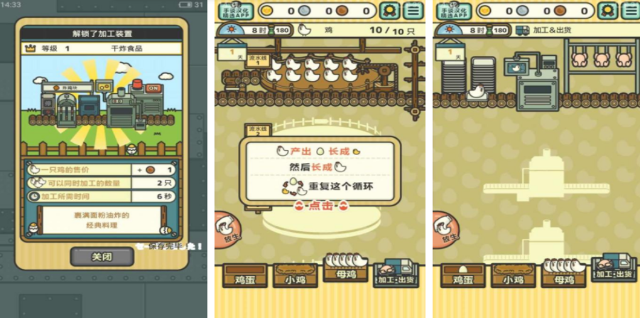 一群小辣鸡是一个经营类型的游戏,游戏里玩家会成为小鸡工厂的一名老板,想要获得收益就需要让这些小鸡产蛋,既可以出售鸡蛋,也可以通过孵化获取新的小鸡,随着小鸡的增多,玩家还需要不断地对工厂进行扩建,每次孵化的过程中,都有机会出现一些稀有的小鸡,可以通过精心培育让他们继续产蛋。