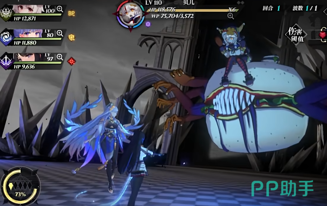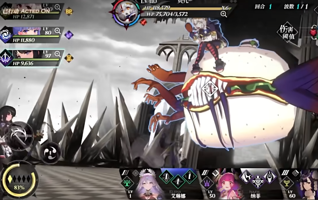 1技能“洪波”,全体魔女能获得可降低34%来自虚弱目标伤害值的水之加护,并对所有敌方施加1层水元素,元素会触发元素融合,这个招式共享冷却时间,在进入战斗的首个回合,她所凭借的魔女行动后对全体敌人释放一次满级“奥法天河”,每个偶数回合,首次使用技能不进入冷却。