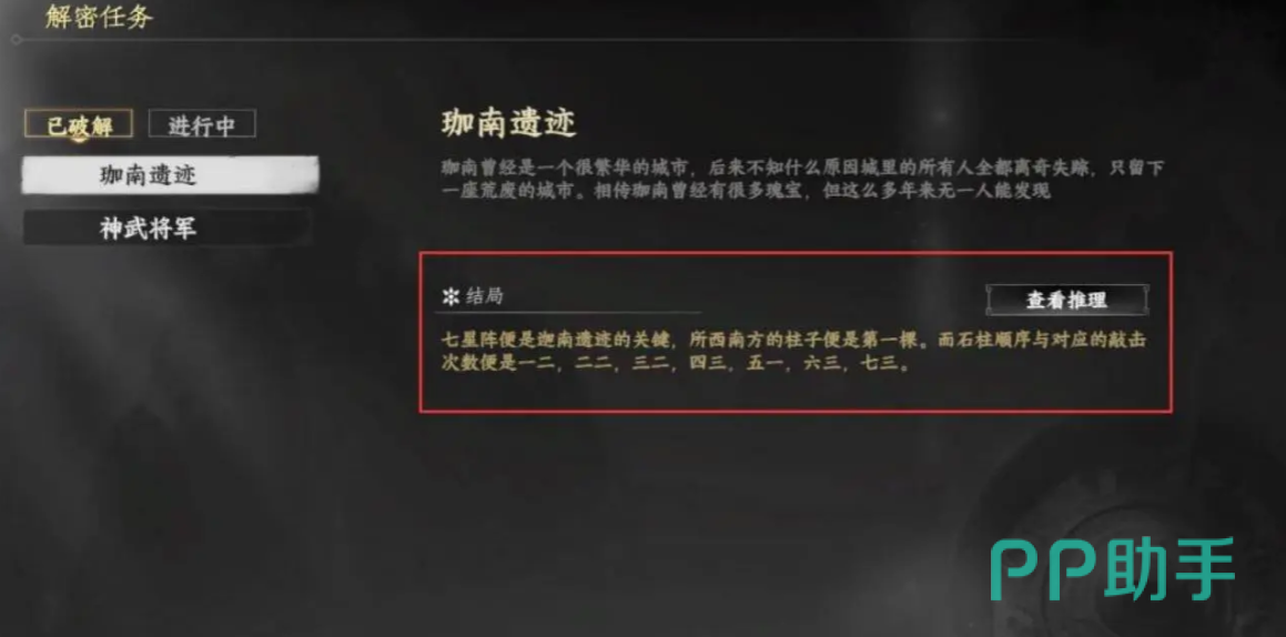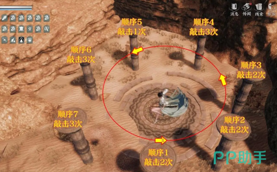 然后点击解谜任务,查看已破解的结局,能得到7根石柱敲击次数和顺序,大家到1794.1433的地方,按照2,2,2,3,1,3,3的敲击次数,也就是下图来进行,就能完成解谜,这个时候石柱都会出现金光,敲击完我们能拿到道具“铜珠”。
